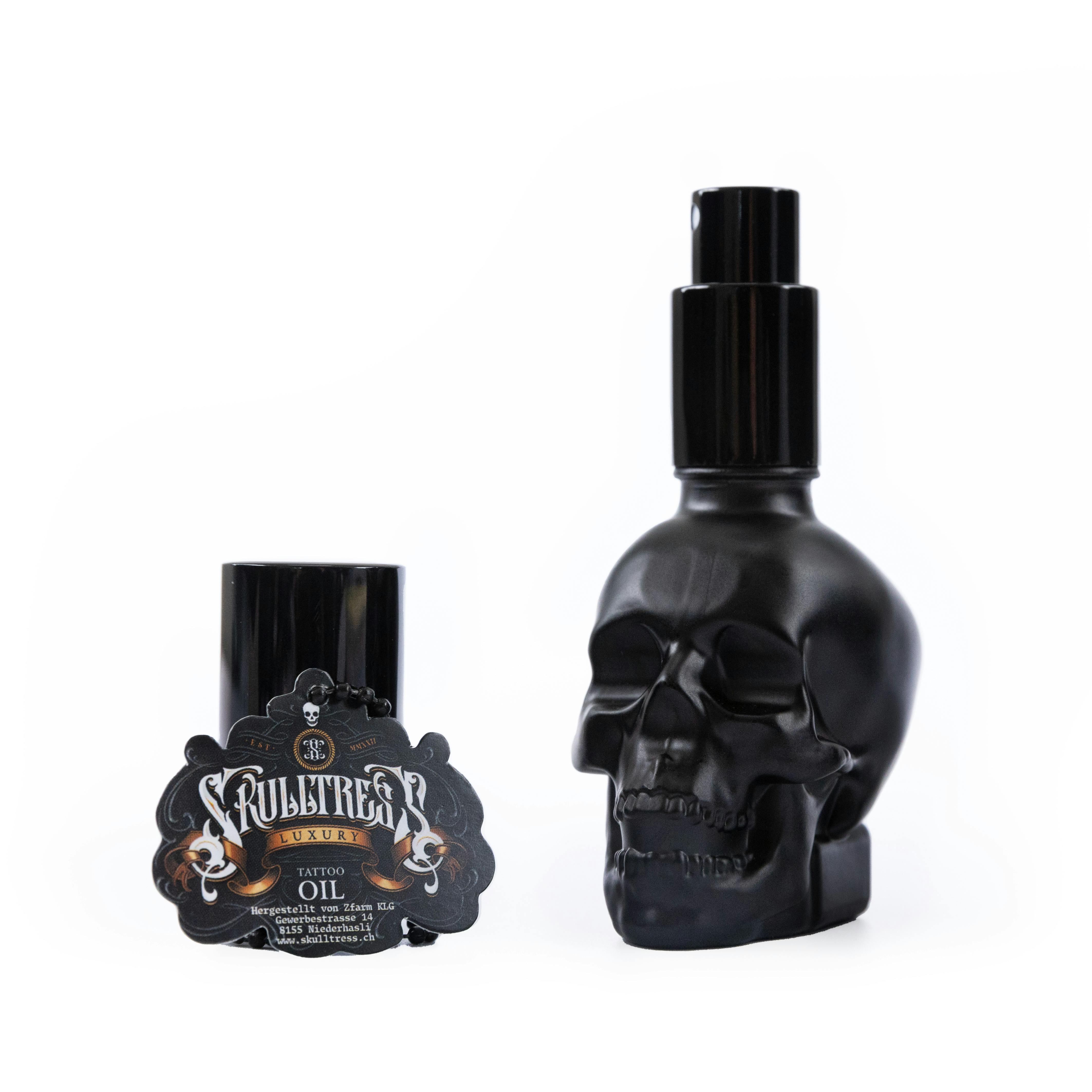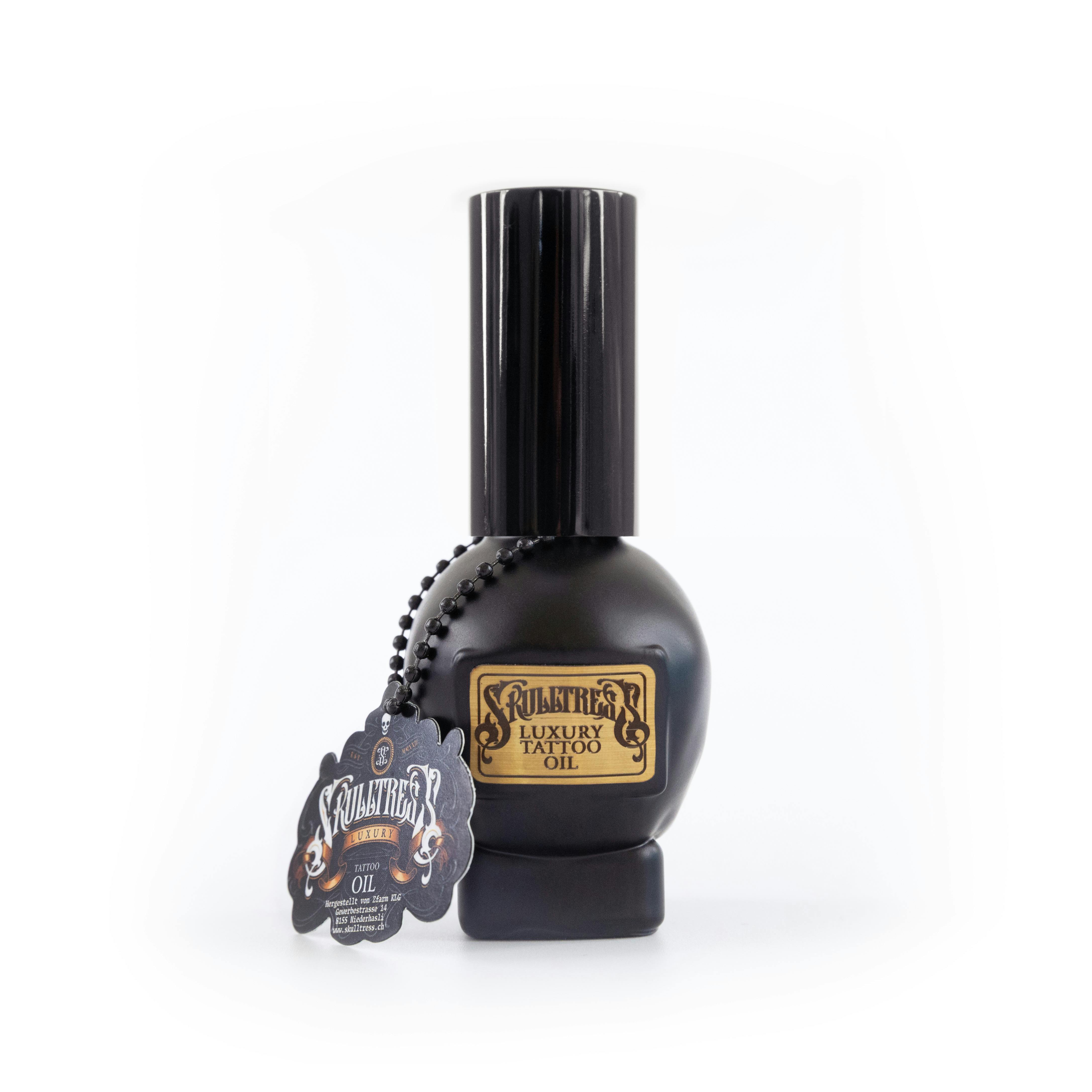 Entdecke das Geheimnis von SKULLTRESS™ NOIR, der luxuriösen Pflege, welche Deine frischen Tattoos nicht nur schützt, sondern sie in neuem Glanz erstrahlen lässt. Die exklusive Mischung aus hochwertigen, konzentrierten Ölen ist perfekt auf die Bedürfnisse tätowierter Haut abgestimmt – ideal für den Alltag und die Heilungsphase.