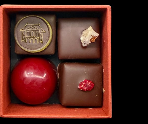 Eine Auswahl von 4 handgefertigten saisonalen Pralinés, die durch Geschmack und Qualität überzeugen und Herzen erobern.