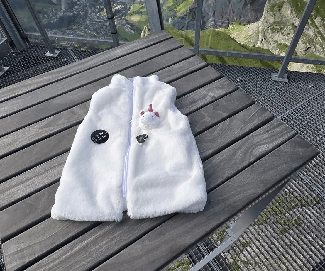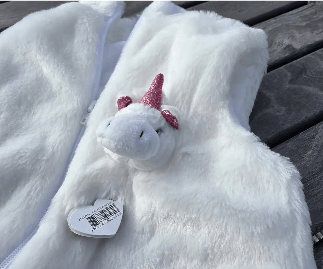 Dieses Plüsch Gilet mit Einhorn ist aus 100 % Polyester fühlt sich unglaublich weich an. Das SUPER Geschenk für das Enkelkind zuhause
