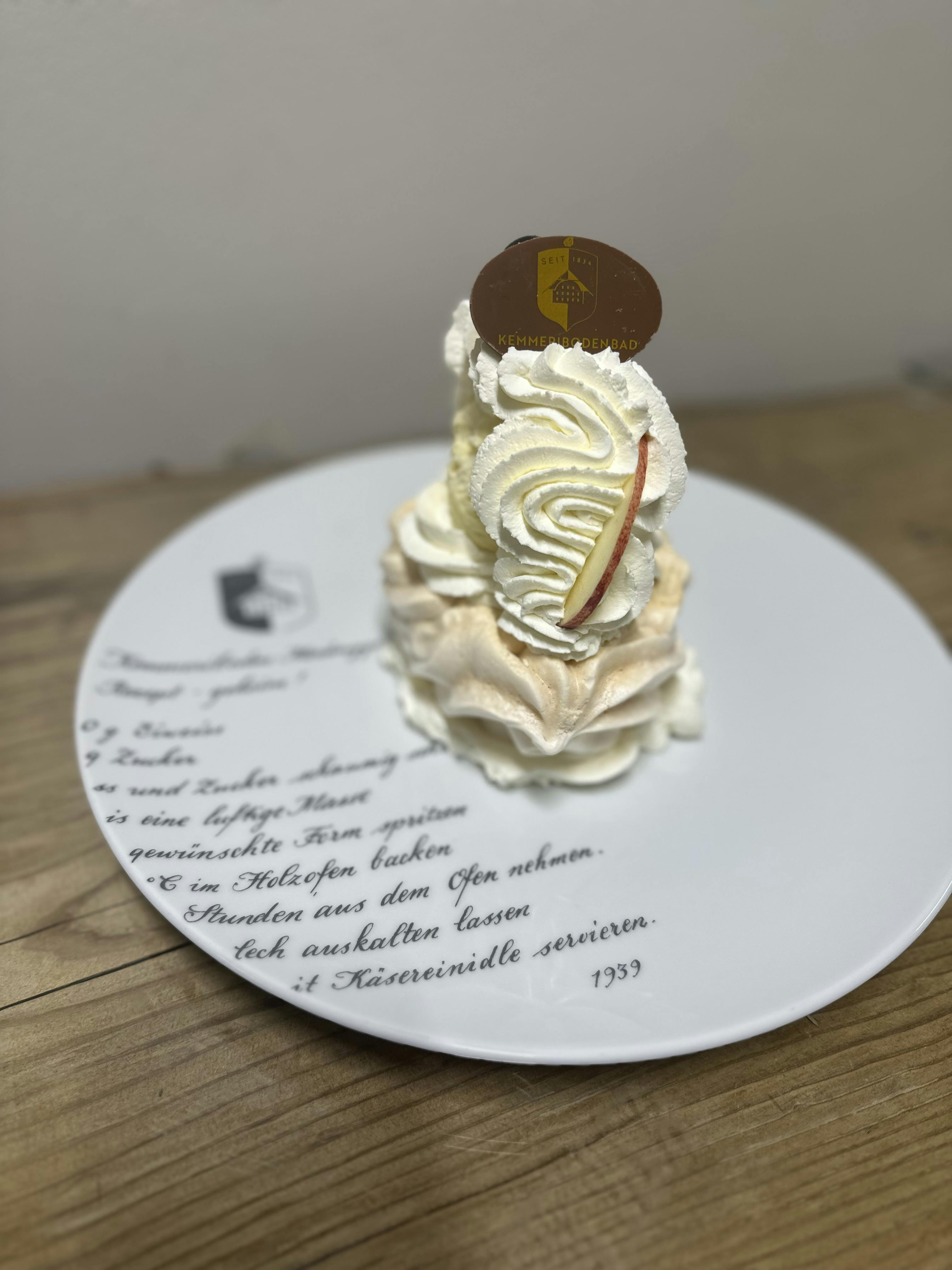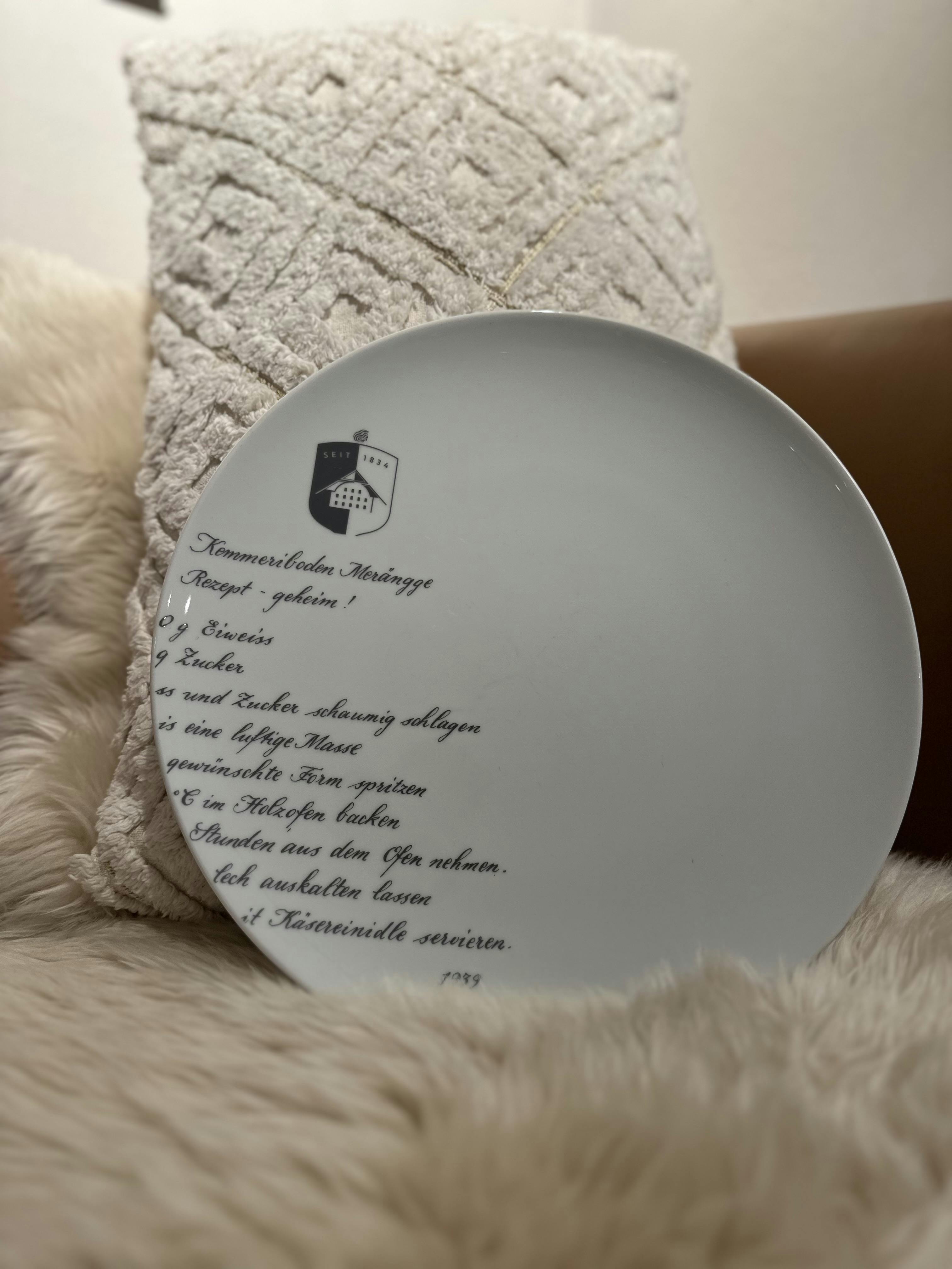 Das Rezept der legendären Kemmeriboden-Merängge ist und bleibt natürlich geheim. Die Merängge lässt sich auf dem Teller natürlich nicht nur gut präsentieren, das Teller verrät auch einen Teil des Rezeptes. Mit ein paar Übungsstunden finden Sie es vielleicht ganz heraus.
