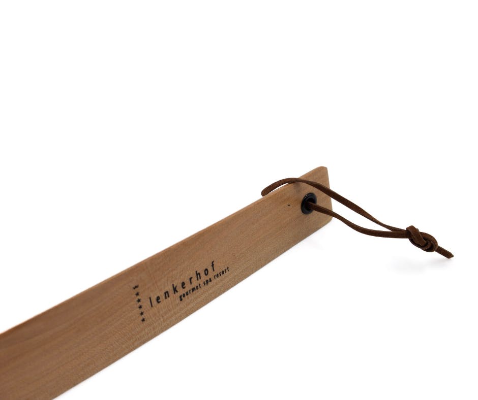 Un souvenir pratique du Lenkerhof : notre chausse-pied en bois avec un cordon en cuir. Le chausse-pied solide permet d'enfiler vos chaussures sans effort, sans solliciter le talon ni abîmer le cuir. Le logo noir du Lenkerhof est soigneusement imprimé sur le bois clair. Mettre ses chaussures devient désormais confortable et facile.