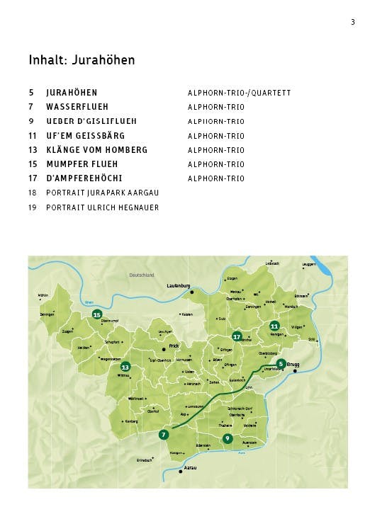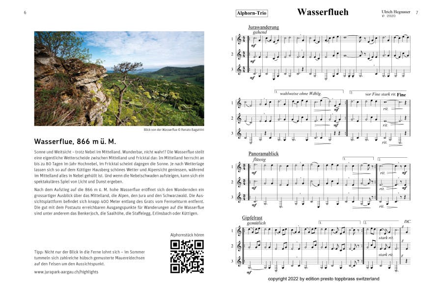 komponierte Ulrich Hegnauer für Alphorn-Trios und -Quartette. Dabei inspirierten ihn die Jurapark-Landschaft und die kulturellen Besonderheiten der Region. Im Heft finden Sie Noten zum Nachspielen sowie QR-Codes zum Anhören der Stücke.
