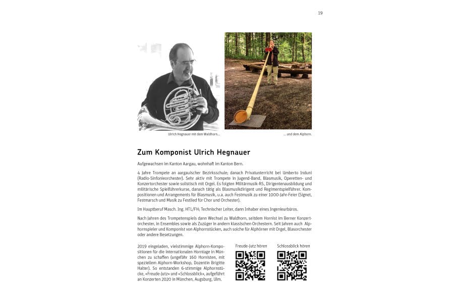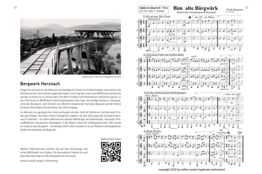 komponierte Ulrich Hegnauer für Alphorn-Trios und -Quartette. Dabei inspirierten ihn die Jurapark-Landschaft und die kulturellen Besonderheiten der Region. Im Heft finden Sie Noten zum Nachspielen sowie QR-Codes zum Anhören der Stücke.