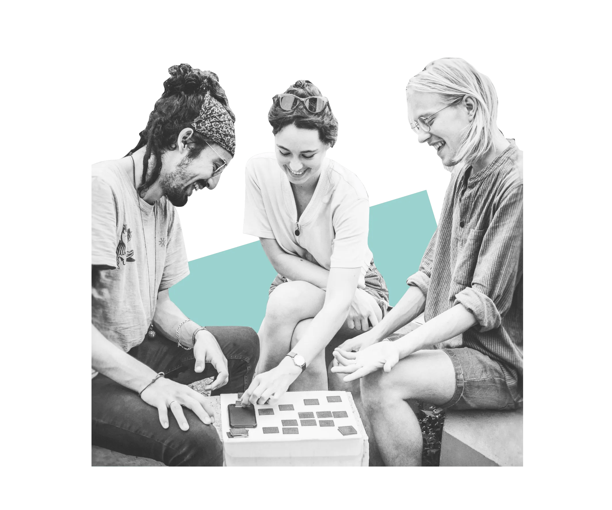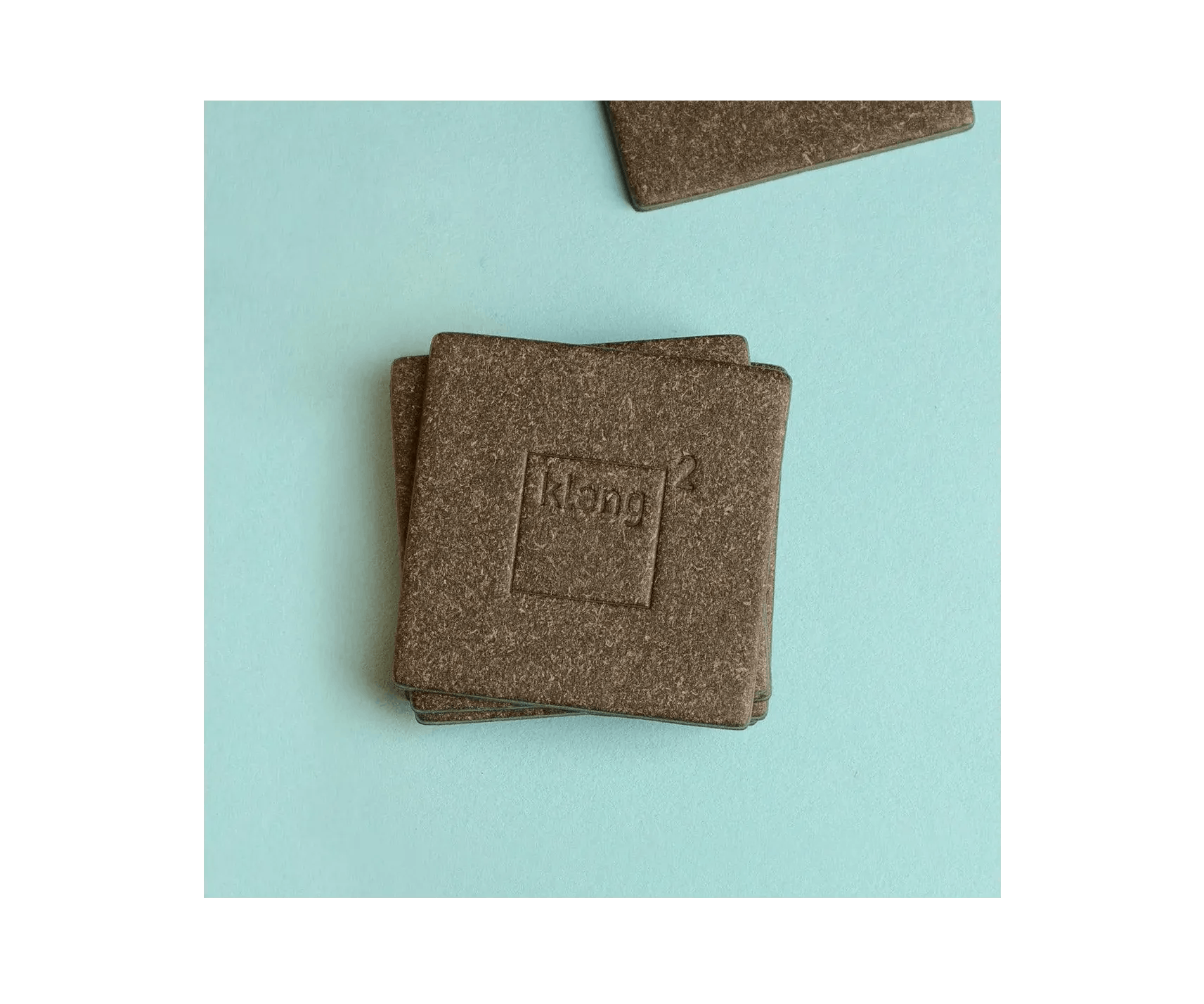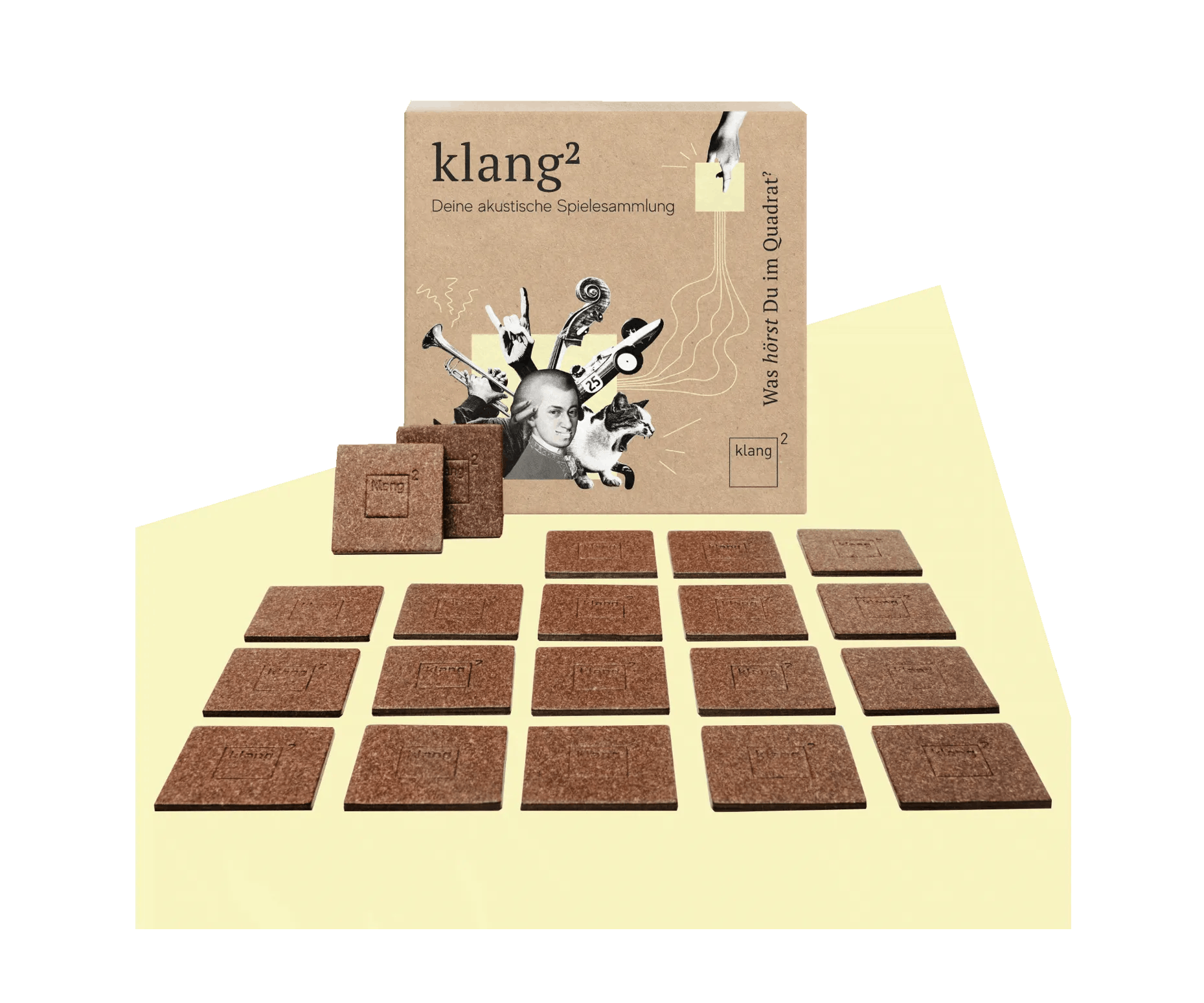 Das Spiel besteht aus 20 eleganten Klangquadraten, die aus hochwertigen Buchbindermaterialien gefertigt werden und mit einem NFC-Chip versehen sind, und der klang² App mit vielen Spielen.