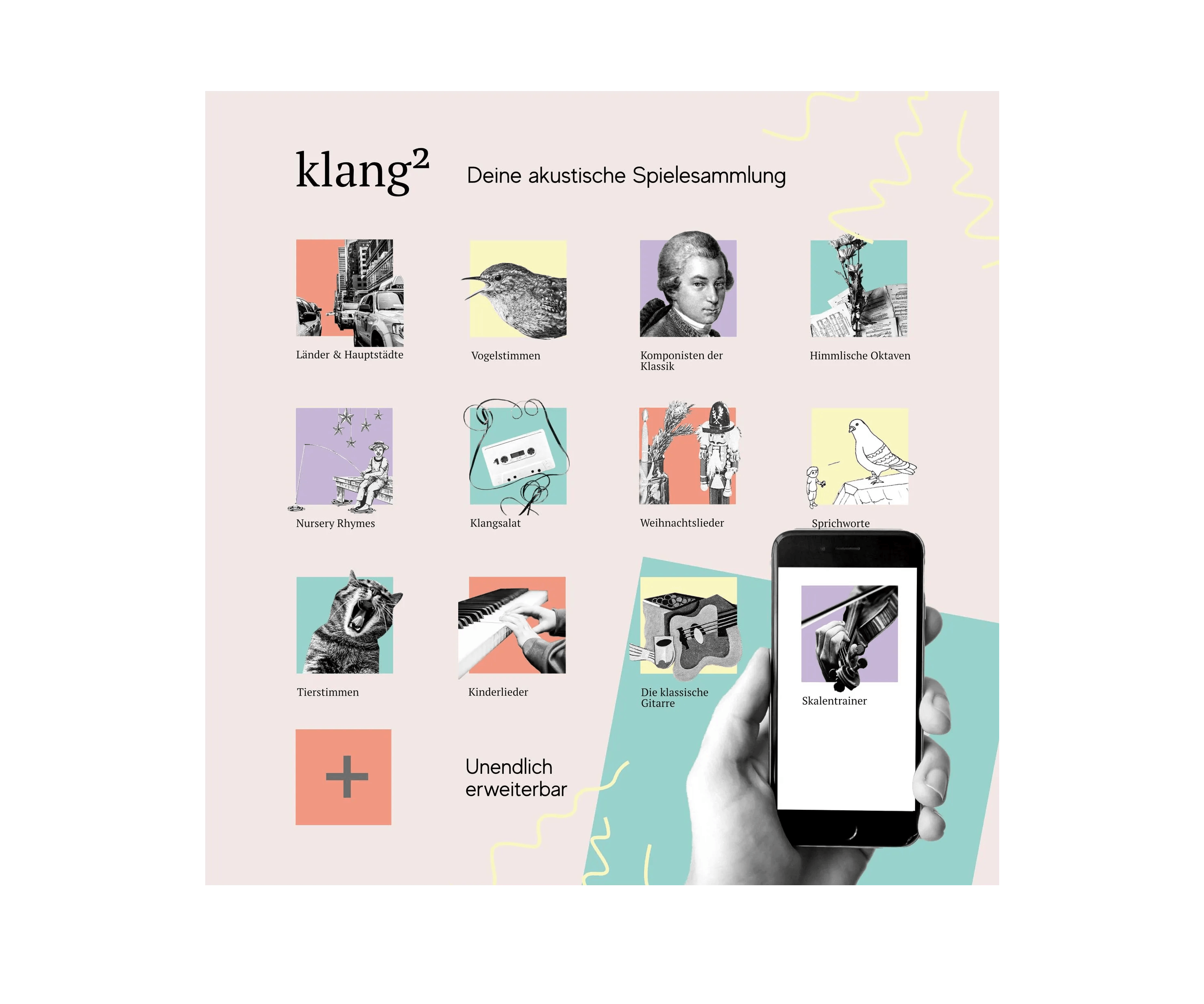 Durch raffinierte Nutzung von Alltagstechnologie entdeckst Du einen Spielspass, wie du ihn vorher nicht kanntest. 20 Klangquadrate erklingen unendlich unterschiedlich in Interaktion mit deinem Smartphone. Über 1.000 Klangsequenzen fordern dein Hörgedächtnis und musikalisches Wissen heraus. Ein Hörvergnügen für Jung und Alt.