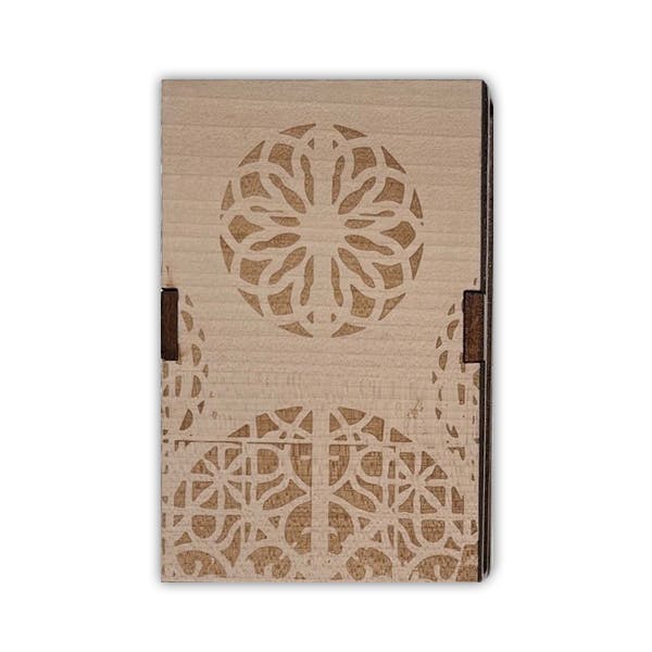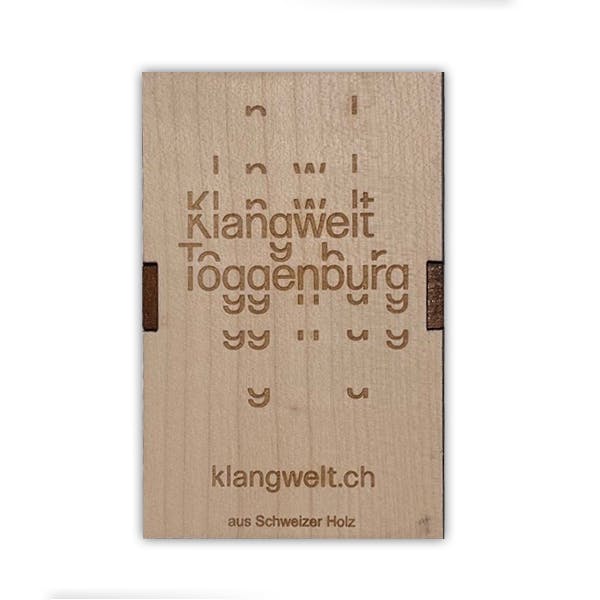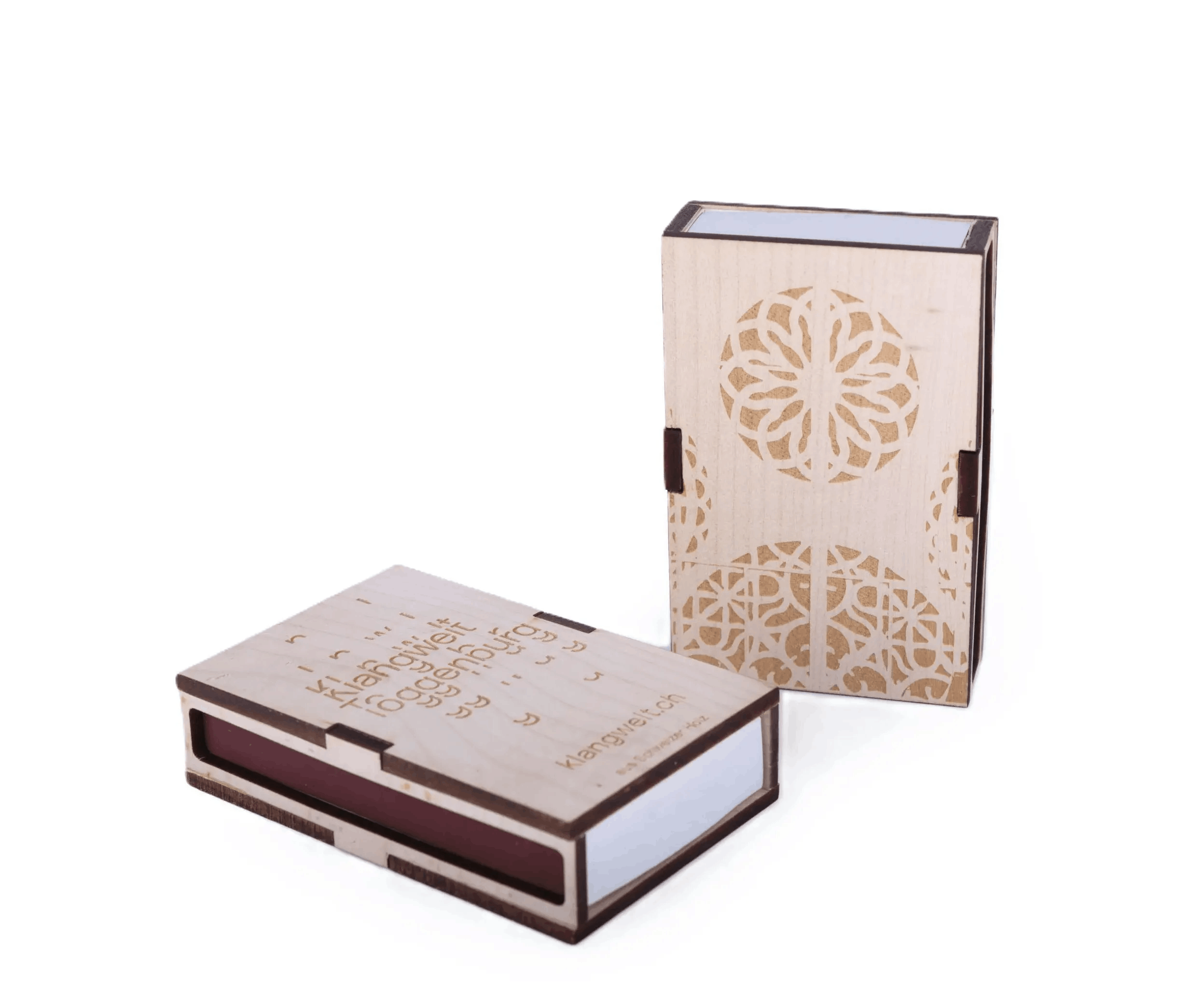 Diese Zündholzschachtel besteht aus Schweizer Ahornholz. Auf einer Seite ist das Wort Klangwelt fein eingraviert, auf der anderen Seite schmücken elegante Klanghaus-Rosetten die Fläche. Die Gravuren werden mit modernster Lasertechnik präzise ausgeführt und verleihen der Schachtel ihren einzigartigen Charakter.