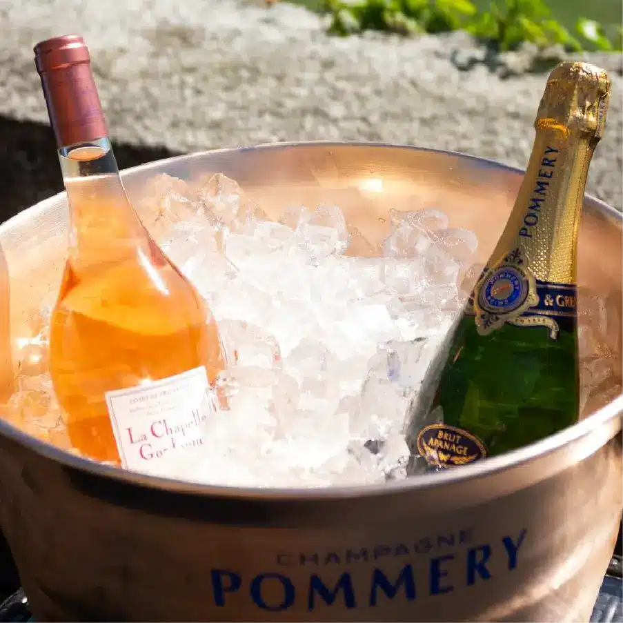 with a bottle of Pommery Champagne and a bottle of rosé