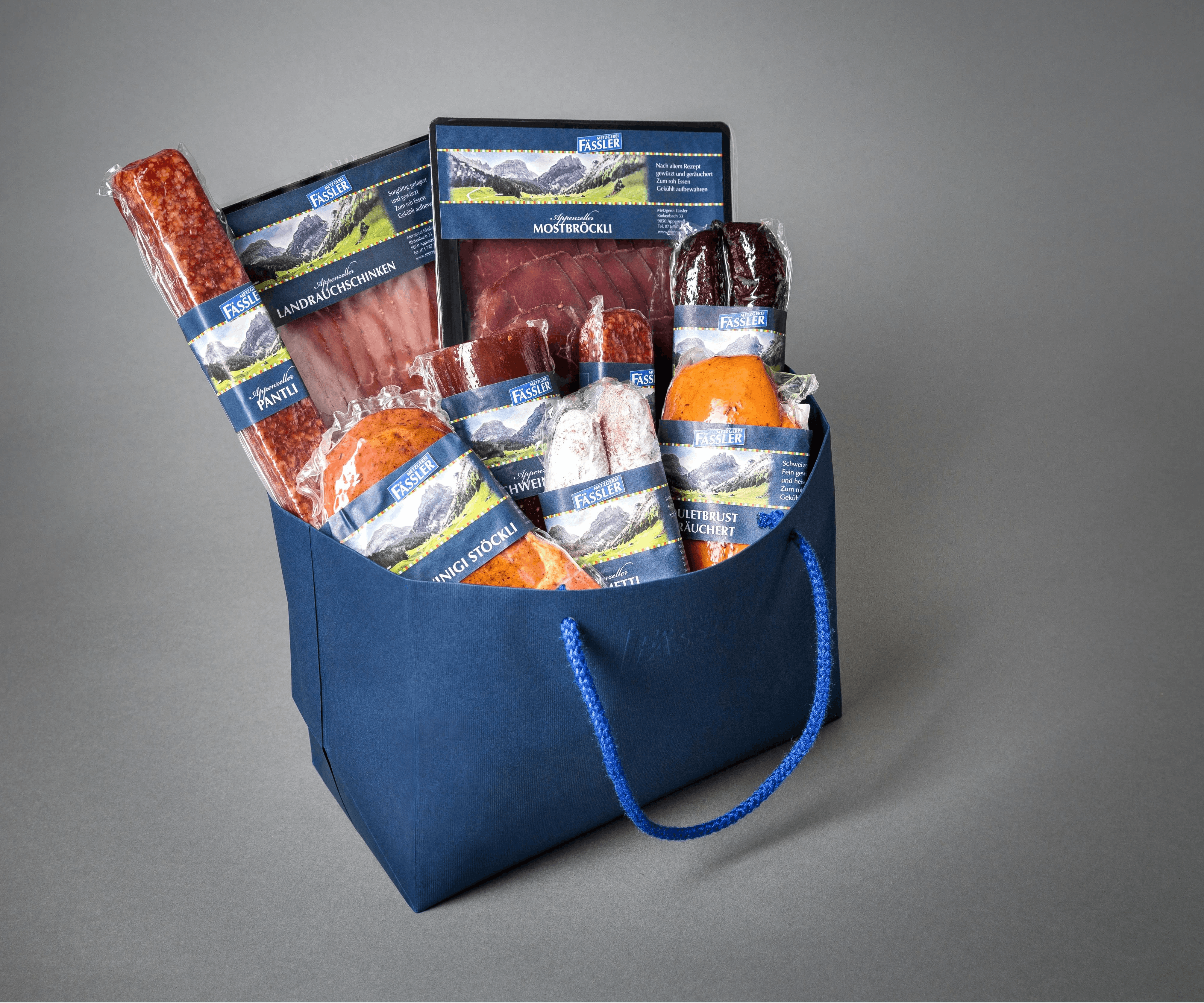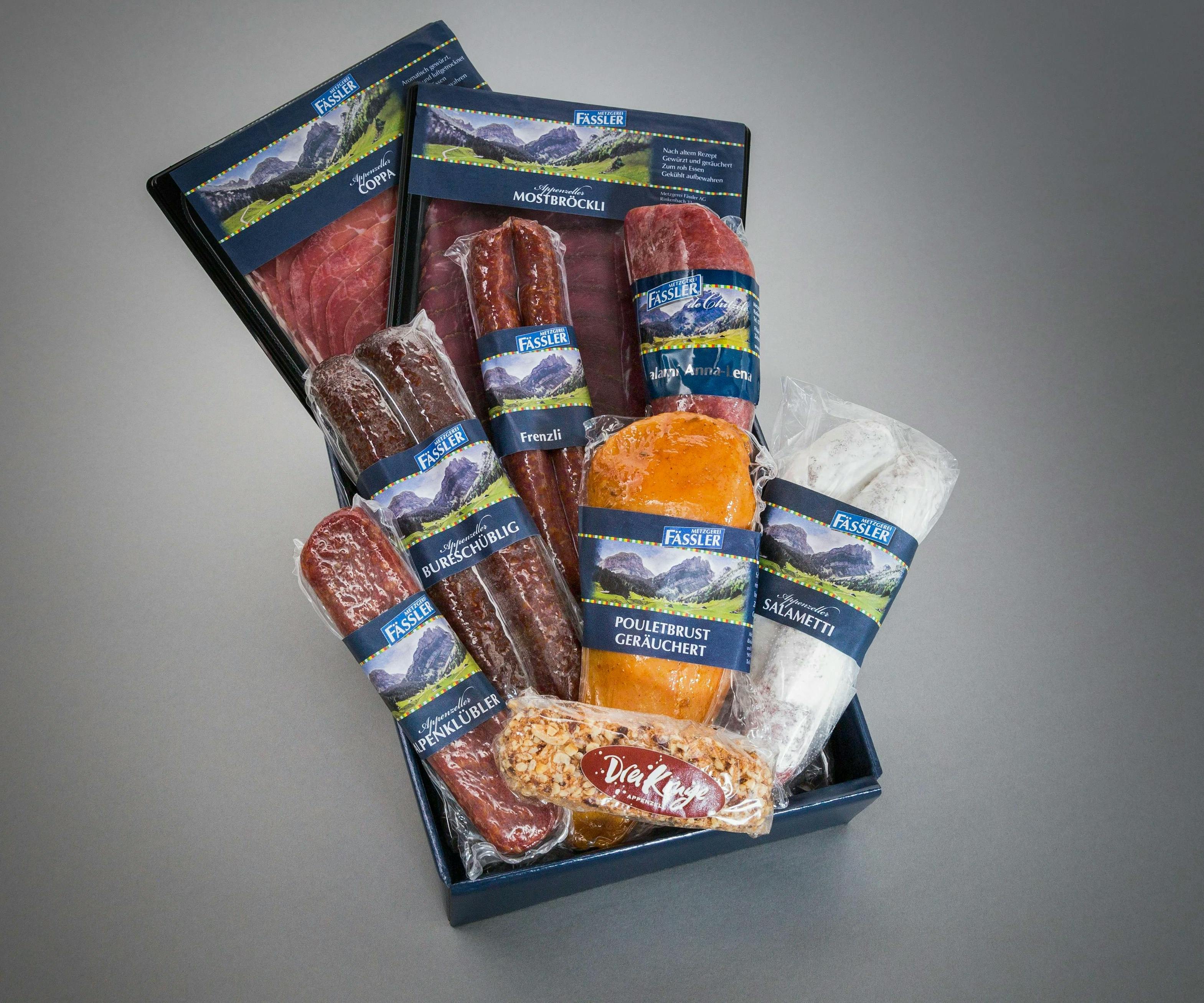 Geniessen Sie die hausgemachten Spezialitäten der Metzgerei Fässler. Je nach Grösse inklusive etwas Süssem, einem Glas Bienenhonig oder einer Konserve.