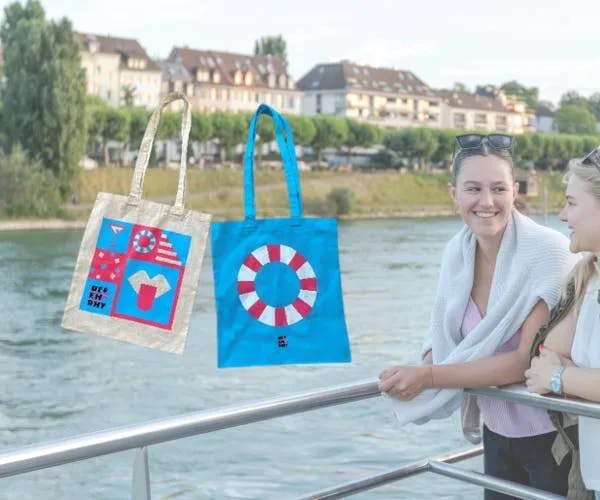 Stylish and sustainable: the fabric bags in blue and nature bring the Rhy feeling directly into your everyday life. Whether you're shopping, swimming or travelling on the Rhy - with their unique motifs, they are the perfect companion for on the go - a piece of Basel for every day!