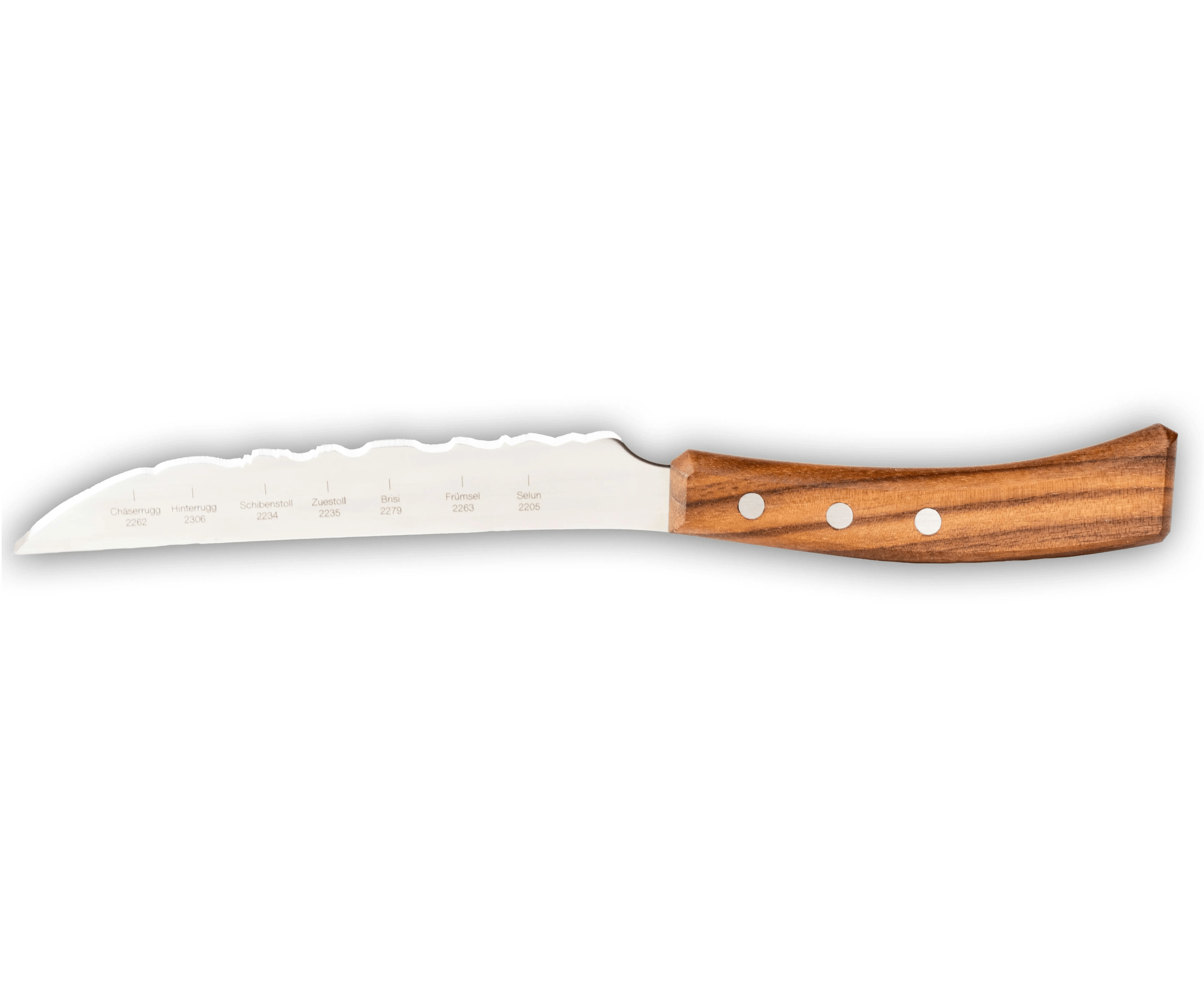 Scharf, schärfer, die Churfirsten. Zugegeben, sie sehen schon ziemlich scharf aus. Am schärfsten sind sie aber auf unserem universal PanoramaKnife. Die blaupolierte Klinge schneidet die Toggenburger Mostbröckli hauchdünn - richtig scharf eben. Der Griff ist aus edlem Palisander-Holz gefertigt. Die Churfirsten jederzeit zu Hause griffbereit zu haben, klingt doch gut – oder? Wir finden schon, denn es ist einfach ein Original – wie das Toggenburg halt.